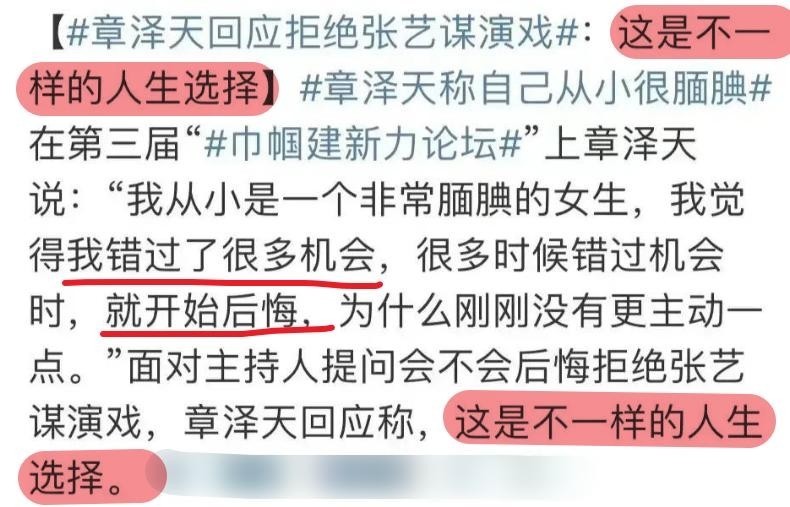 走红之后,著名导演张艺谋曾亲自向她发出合作邀请,希望她参演电影作品。然而章泽天果断拒绝了这份看似光鲜的机会。